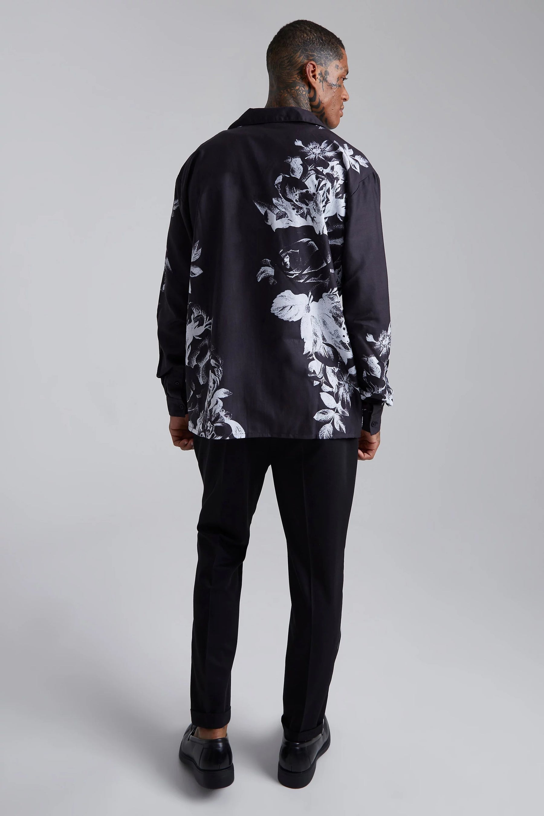 BOOHOOMAN LONG SLEEVE OVERSIZED FLORAL PRINT SHIRT IN BLACK
